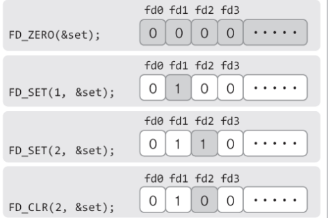 select 함수를 이용하면 배열에 저장된 다수의 파일 디스크립터를 대상으로 여러가지 행동을 취할 수 있다.