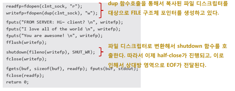 위와 같은 방법으로 dup를 이용해 파일 디스크립터를 분리하고, file 구조체 포인터를 각각의 디스크립터에 생성하고 있다. 이렇게 되면, shutdown을 진행했을 때 half-close가 실행되게 된다.