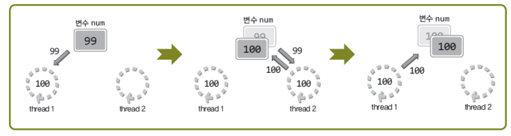 둘 이상의 thread가 한 변수에 접근할 때, 한 상태가 적용되지 않은 상태로 접근을 하면 문제가 일어난다(동시성 문제)