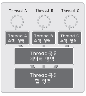 위의 사진처럼 쓰레드는 완전히 독립적인 실행 흐름을 가지고 있다. 하지만 쓰레드는 아래 사진처럼 프로세스 내에 형성된다. 그래서 context switching의 부담이 덜하며, 데이터 교환이 쉽다.