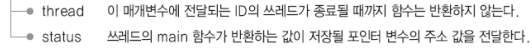 int pthread_join(pthread_t thread, void **status);