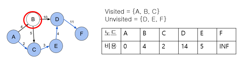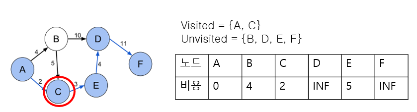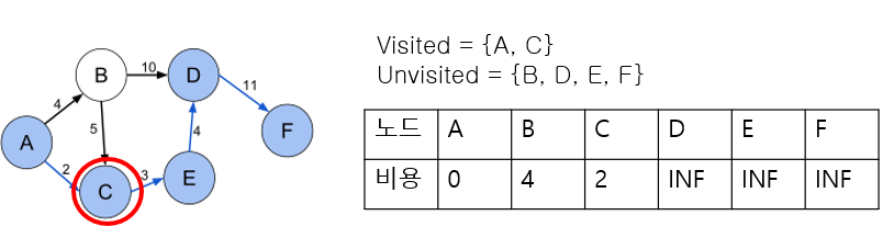 3. 방문하지 않은 노드 중 가장 비용이 낮은 노드로 이동한다. (우리 문제 상황에서는 C에 해당한다)