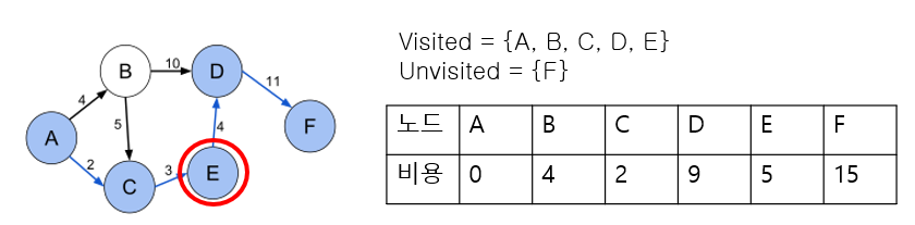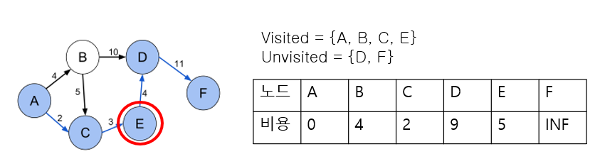 => E를 보면 A -> E : INF , A -> C -> E : 2 + 3 = 5이다. 즉, min(cost[E],cost[C] + 3) 을 취하면 된다.