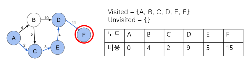 모든 정점을 방문을 완료했다. 이때, 만들어진 표가 A에서 각 정점으로 갈 때의 최소 비용이다.