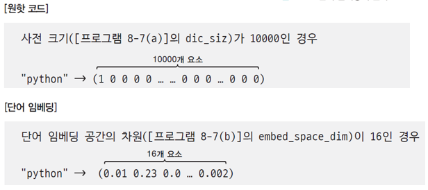 하지만, 원핫코드는 사전 크기가 클 수록 너무 길어지며, 단어 상이의 연관 관계를 반영하지 못한다.