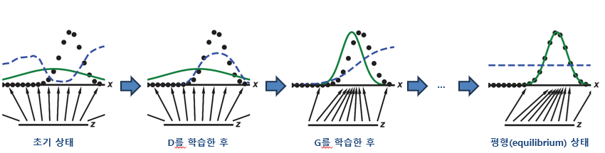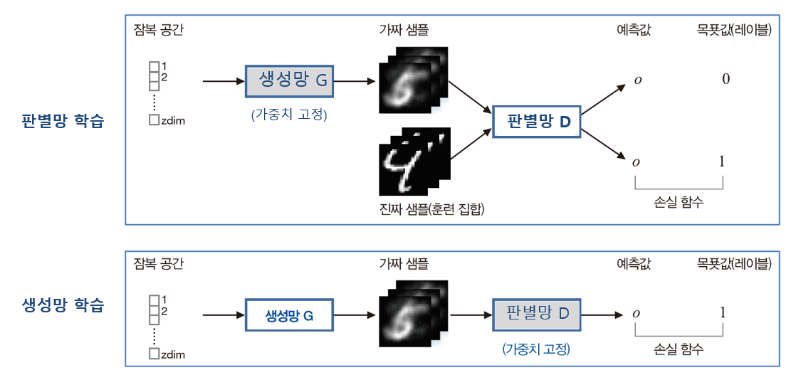 판별망 D와 생성망 G가 있다. D와 G를 번갈아가면서 학습한다.