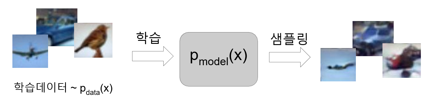 - 암시적(implicit) 밀도 추정 : P_model(x)를 명시적으로 정의하지 않고도 샘플링 할 수 있는 모델을 학습하는 방법