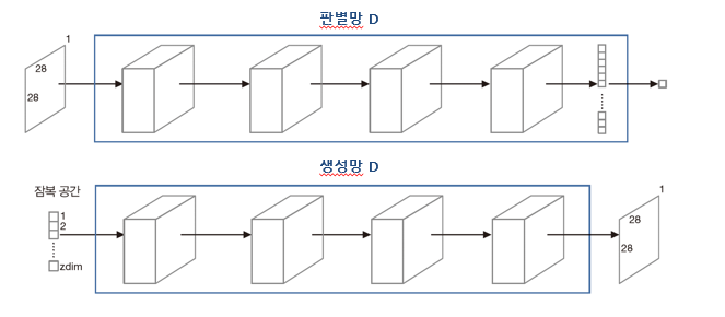 판별망 D는 분류하는 사진의 진짜와 가짜를 분류한다. 판별망에는 G가 생성한 가짜 샘플과 실제 사진 샘플이 들어오는데 이를 구분하면 된다.