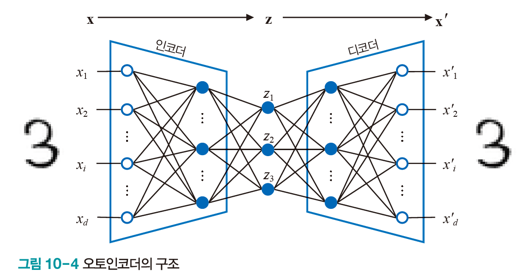 입력 패턴과 출력 패턴이 같은 신경망이다. 사람이 레이블을 달 필요가 없는 비지도 학습이며 영상 압축, 잡음 제거, 특징 추출, 생성 모델에 사용한다.