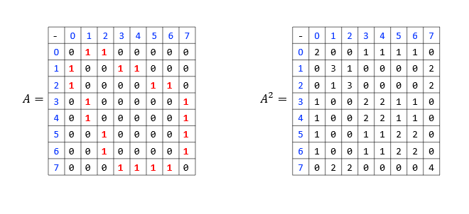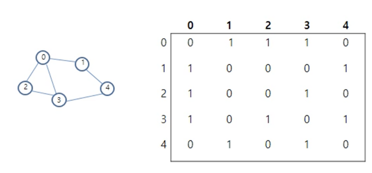 vertex에 대해 2차원 배열을 생성하고 각 vertex에 대해 인접한 vertex를 1, 아닌 것을 0으로 할당한다. 방향성이 없을 때는 대각선을 기준으로 대칭의 형태를 보인다.