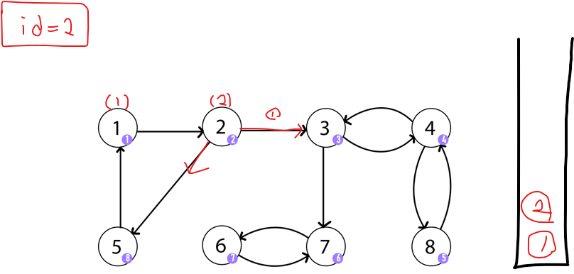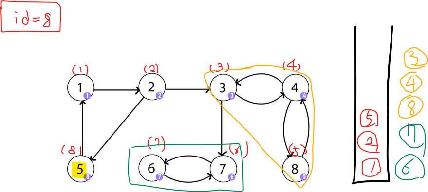 - 더 이상 방문할 새로운 노그가 없으면서 본인의 부모 노드로 갈 수 없을 때에는 stack에서 본인 노드를 찾을 때 까지 꺼내준다. 이것이 본인을 노드로 하는 SCC이다.