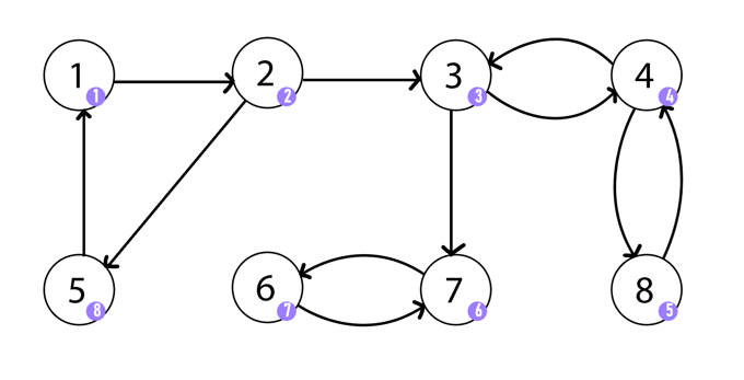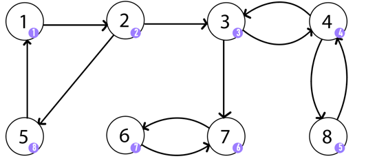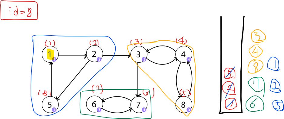 이제 모든 정점을 방문했으니 dfs가 종료된다. 최종적으로 얻은 쌍은 {1,2,5}, {3,4,8}, {6,7}이다.