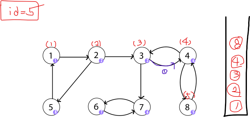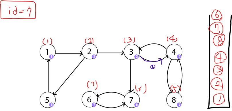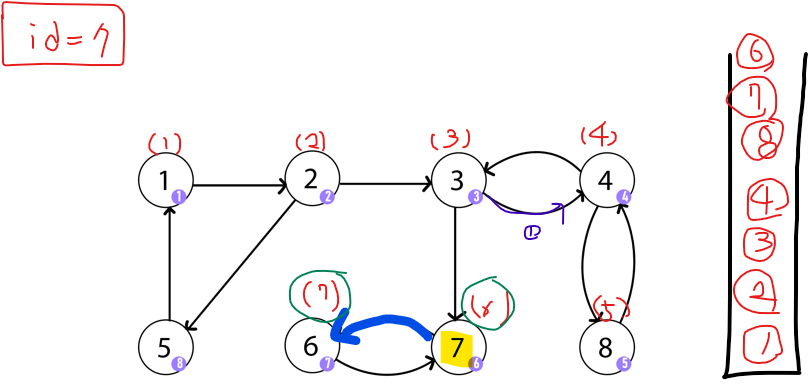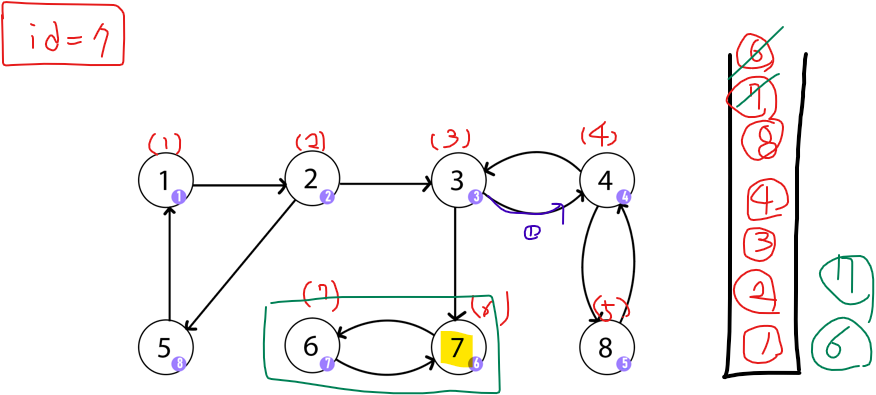 6에서 재귀가 풀리면서 7로 도착한다. 7의 경우는 앞의 경우와 다르다. 더 이상 방문하지 않은 노드로 이동할 수 없는 상태인 것은 동일하다. 하지만, 7에서 갈 수 있는 노드는 6밖에 없는데 6이 자신의 부모가 아니다. (6의 id 값이 7의 id 값보다 작다. ) 그래서 7은 SCC의 부모임을 알 수 있다.