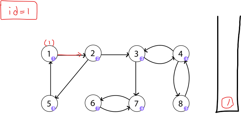 1번 노드에 id값을 기록하고 본인을 stack에 넣은뒤 연결된 2번 노드로 이동한다.