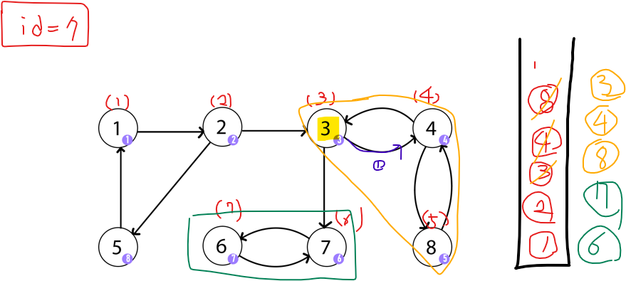 dfs의 재귀가 풀리고 4에 도착한다. 4도 8과 같은 이유로 3, 8과 연결되어 있는데 3이 부모이기 때문에 재귀가 풀린다. 3은 아직 방문하지 않은 7이 있어서 방문한다.(id = 6이 됨) 그리고 6도 이어지니 방문하게 된다.