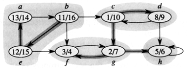 예를 들어 위와 같은 그림을 보자. 이 그래프에서 SCC들은 {a, b, e}, {c, d}, {f, g}, {h} 가 있다. 물론 h에서 h로 가는 간선이 없는 경우에도 {h}는 SCC를 이룬다.