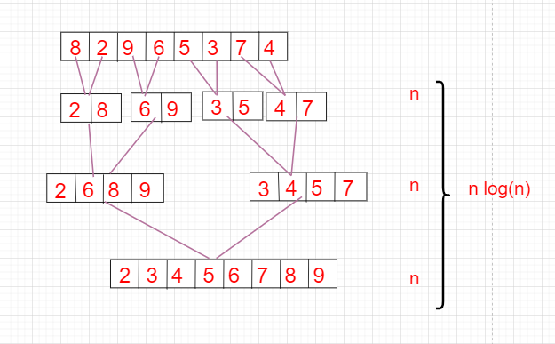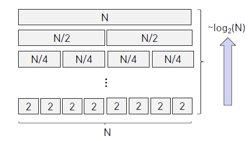 N개 값을 Merge해야하기 때문에 N에 비례한 비교를 진행한다. 그리고 이 과정을 log2(N)회 반복하기 때문에 (반으로 잘라 나가기 때문에) ~Nlog2(N) 의 시간복잡도를 가진다.