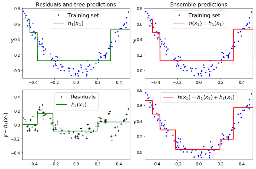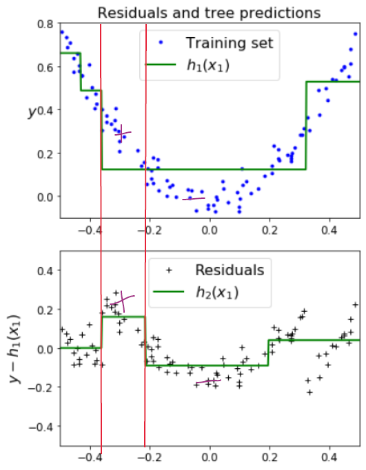 위 사진의 붉은 선 부분을 보자. 위쪽이 y를 보고 h1(x)를 학습한 모습을 보여준다. 붉은 선쪽을 보면 초록선(h1(x)) 보다 위쪽에 있는 데이터셋은 아래 그래프에서 0보다 위쪽에 있는 것을 볼 수 있다. 이렇게 차이점을 데이터셋으로 넣어 다시 한번 더 train하면 오차 부분을 보고 정확도를 높일 수 있다.