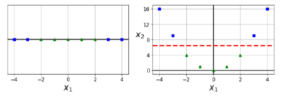 x2 = x1 ^ 2 이라고 하자. 위 사진에서 x1은 linearly seperable하지 않지만, 오른쪽의 경우는 쉽게 나눌 수 있다.