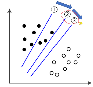 왜 여백을 최대화 해야하는가? 그 이유는 최대한 일반화 능력을 기르기 위함이다. 일반적인 모델은 1번에서 시작해서 점점 학습을 해나가다가 2번 선을 찾으면 학습을 종료할 것이다. 왜냐하면, train 데이터에 대해 100% 분류하는 선을 찾았기 때문이다. 하지만, SVM은 단순히 분류하는 것이 목표가 아닌 두 데이터 사이의 여백(간격)이 제일 큰 선을 찾는 것이 목적이기에 3번까지 도달해서야 학습이 끝난다.
