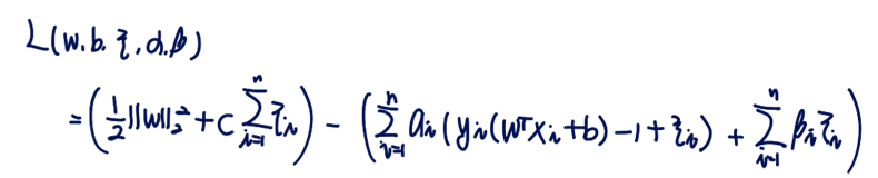 목적함수와 제약조건을 하나의 식으로 만든 L(w, b, α) 는 아래와 같다.
