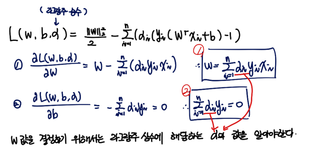 정리한 식이 위(1, 2번 빨간 네모 식) 처럼 나왔다. 우리는 b, w를 구하기 위해서 최종적으로 라그랑주 상수에 해당하는 값인 α를 찾아야한다는 것을 알 수 있다.