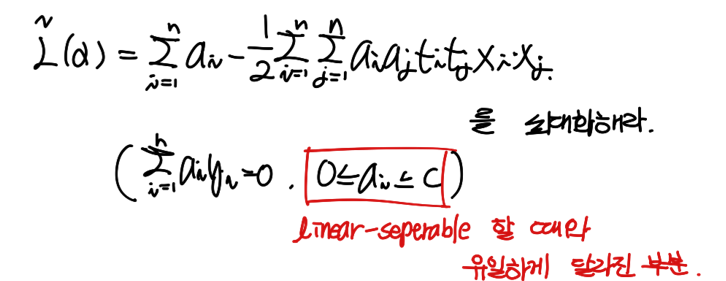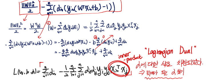전개하면서, W와 b가 사라지고 α에 관한 식으로 변했다. 결국 Lagrangial Dual 문제로 변환이 된 것이다.
