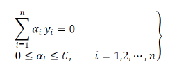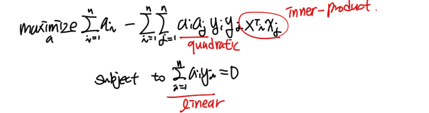 우리는 위 α에 관한 위 식을 최대화하는 α를 찾아야한다. 이때, 목적함수는 α에 대한 2차식이고 조건이 1차이기 때문에 KKT condition을 이용해 α 값을 구한다.