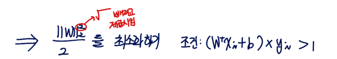 하지만, W가 분모에 있으니 문제가 복잡해져서 최대화 문제를 역수를 취하고 W에 제곱을 취해 최소화 문제로 고쳐보겠다. ( 제곱을 하는 이유는 l2 norm에 root 가 있어서 복잡해지기 때문 )
