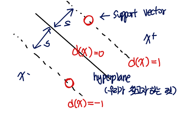 위의 진한 선이 d(x) = 0 선이다. 이 보다 위쪽에 있는 점들을 x+ 아래쪽에 있는 점들을 x-라고 하자. x+ 쪽의 support vector는 d(x) = 1 위에 있다. 그리고 x- 방향의 support vector는 d(x) = -1 위에 있다.