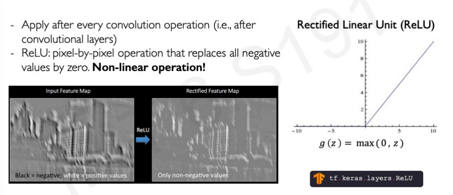 Non-linearity도 굉장히 중요한 개념 중 하나라고 소개하고 있다. non-linearity한 대표적인 function 이 ReLU이다. non-linear을 적용하면 우리가 중요하게 생각하지 않는 Feature을 제거하여 볼 수 있다. 특히, ReLu의 경우 negative value를 zero로 변환하여 positive value에 더 집중할 수 있도록 해준다.