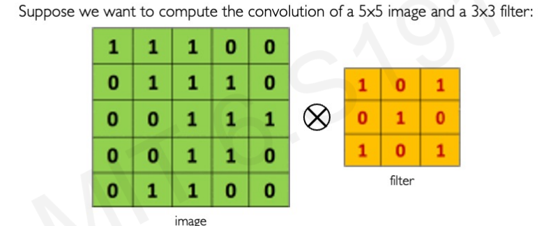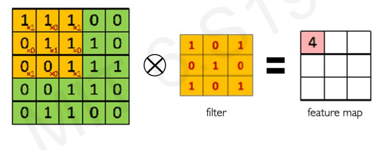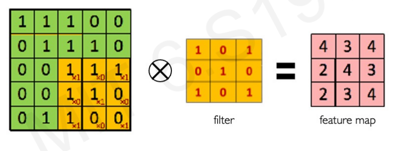 그럼 구체적으로 convolution operation은 어떻게 진행될까? 5X5 Image와 3X3 filter가 있다고 하자.