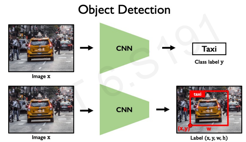 앞에서 계속 했던 image classification은 단순히 객체가 있냐 없냐를 나타내는 것이다. 지금부터 볼 object detection은 image에 object가 있는지에 대한 여부 뿐만 아니라 어디에 존재하는지까지 탐지하는 것을 의미한다. 보통 bounding box로 나타낸다.