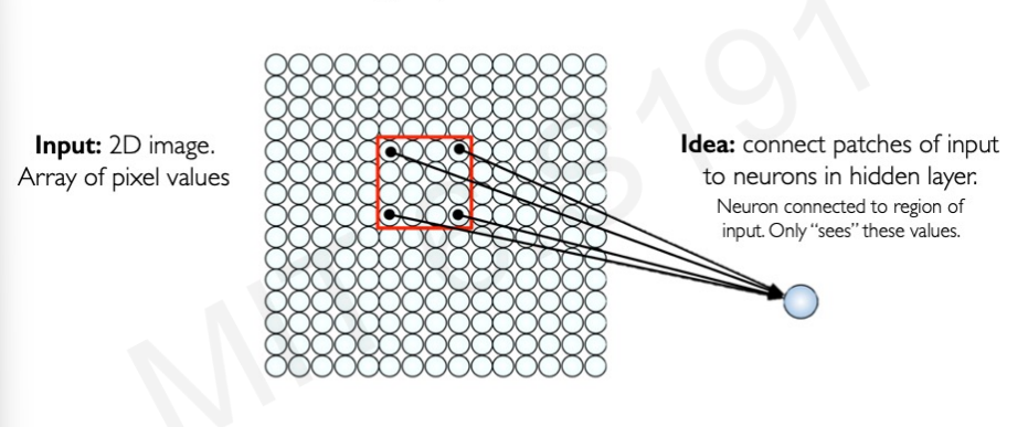 이미지의 공간적인 정보를 고려하기 위해 아래와 같은 방식으로 이미지의 일부분을 patch 형태로 잘라서 하나의 뉴런으로 전달하는 방식으로 hidden layer를 고안하는 방식이 탄생했다.