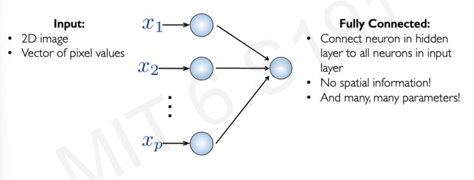 이미지는 pixel 값의 vector로 한 이미지에 무수한 픽셀이 존재한다. Fully Connected되면 굉장히 파라미터가 많아진다. 그리고, 이미지는 서로 공간적인 특성도 가지고 있다. 하지만, 이 방식은 Spatial information이 존재하지 않는 문제점이 발생한다.