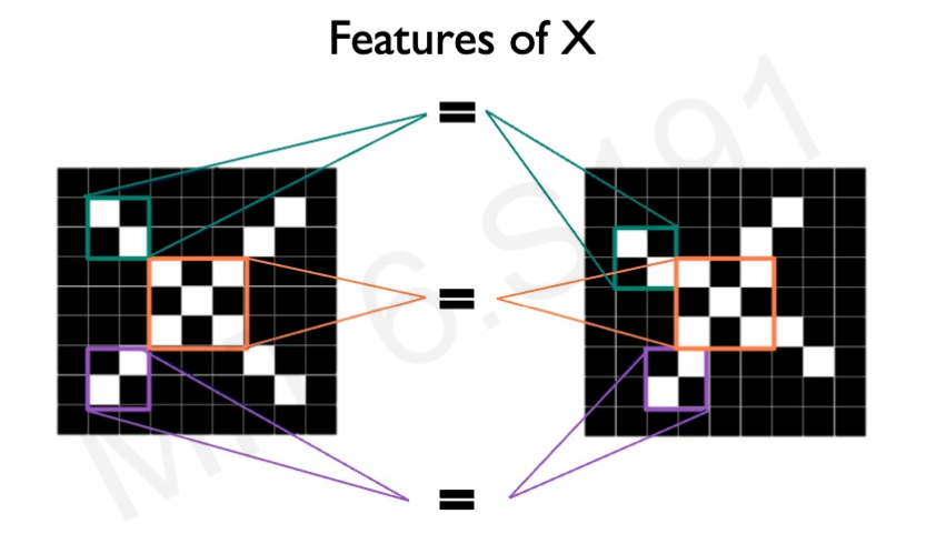서로 모양이 다른 두 X가 있다고 하자. 이것을 이미지 pixel value로 표현하면 위와 같다. 우리는 두 X를 모두 같은 X로 판단하고 싶다.