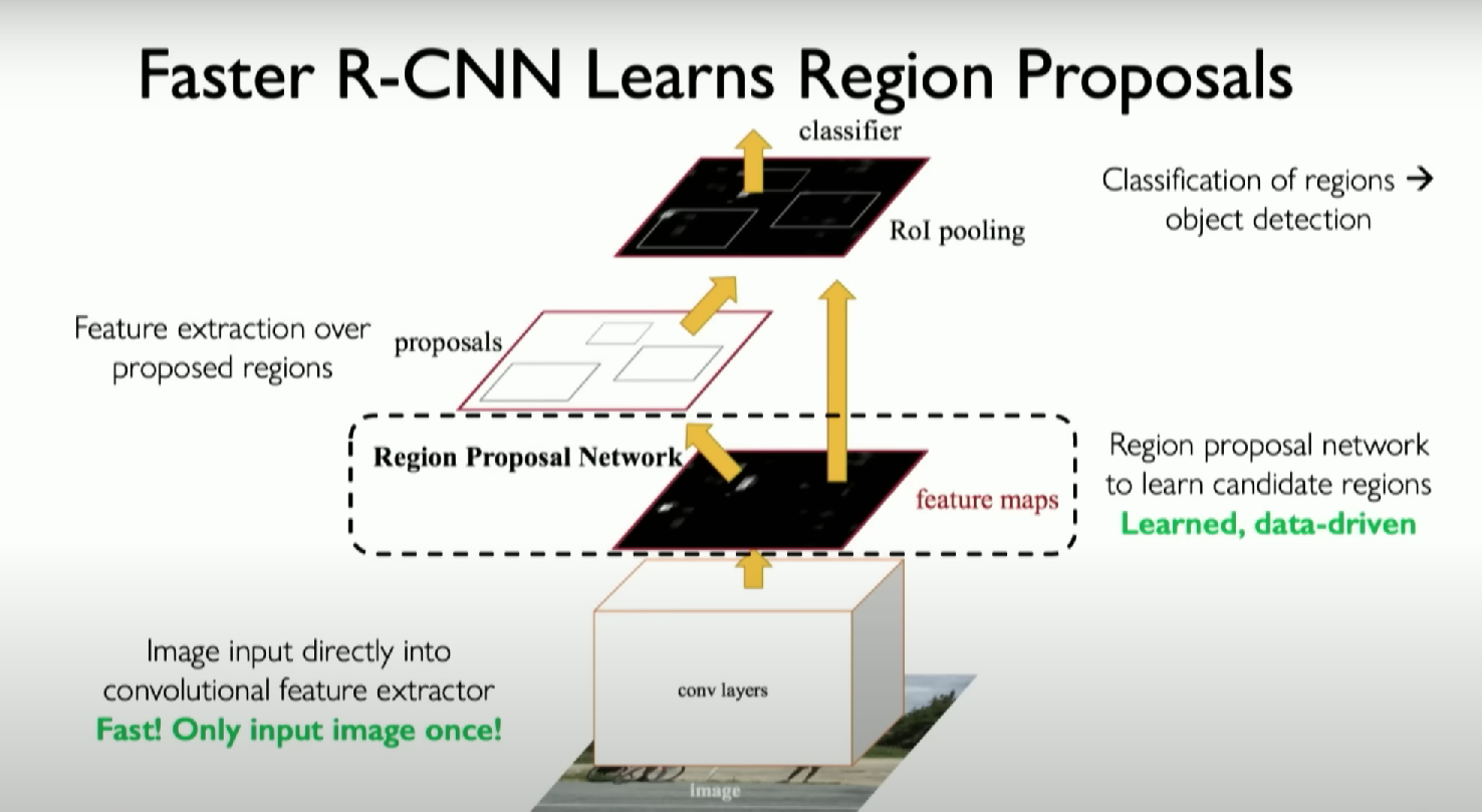 가장 중요한 특징은 주요한 특징이 있는 지역만 다음 단계로 보내는 것이다. 그 뒤에 각각의 지역이 무엇에 해당하는지 추출한다. 이것은 매우 빠르게 실행되기 때문에 실생활에서 가장 많이 쓰이는 모델이다.