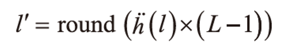h' ( 원래는 h 위에 . 이 있으나 서술 편의상 ' 로 기술하겠음 ) 는 히스토그램을 정규화 한 것이며, h''는 이 정규화한 히스토그램을 0~i 번 째의 합으로 표현한 값을 가지고 있다.