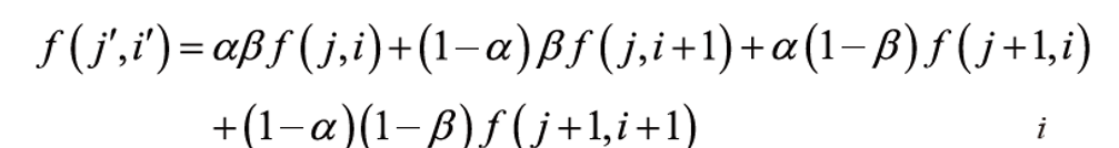 이 방식은 화소가 걸친 비율에 따라 가중 평균하여 화솟값을 계산한다. 그리고 겹치는 비율을 곱하는 방식이라 선형 보간법에 해당되며, x와 y 모두 고려하기 때문에 양선형 보간법이라고 한다.