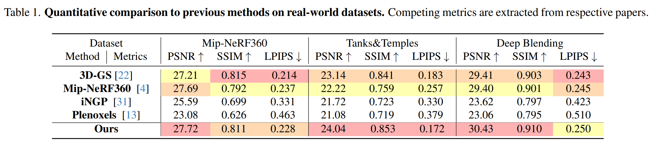 3D-GS : selected as our main baseliine for its esablished SOTA performance (trained for 30k iterations)