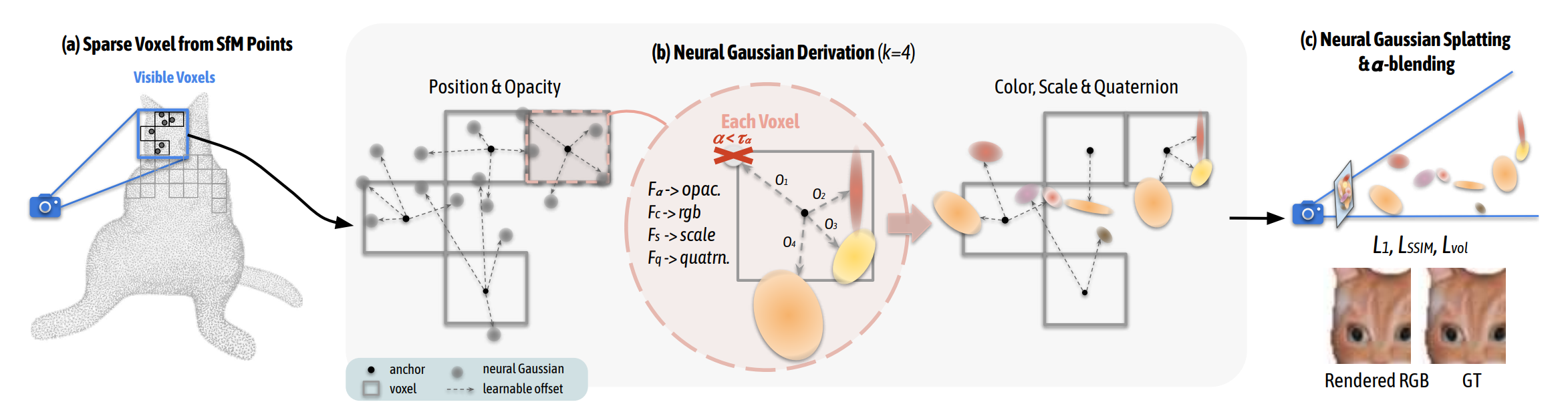 Framework. (a) We start by forming a sparse voxel grid from SfM-derived points. An anchor associated with a learnable scale is placed at the center of each voxel, roughly sculpturing the scene occupancy. (b) Within a view frustum, k neural Gaussians are sp