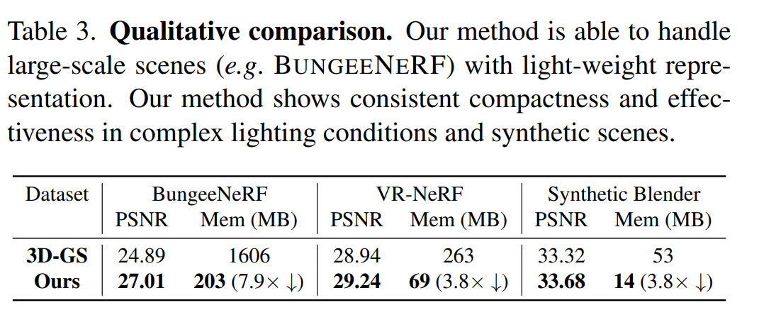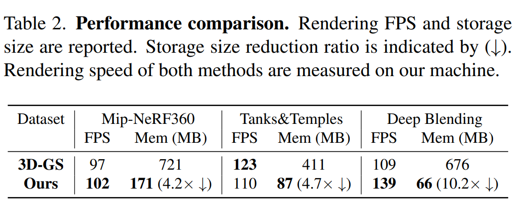 As a result, this approach can render at a similar speed as the original 3D-GS with little computational overhead