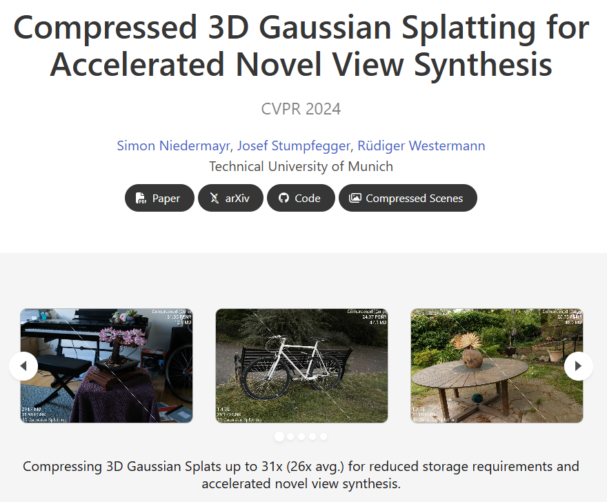 - Title : Compressed 3D Gaussian Splatting for Accelerated Novel View Synthesis