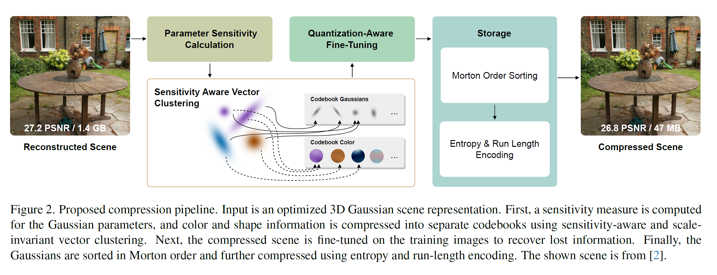 After quantization-aware fine-tuning, the compressed scene representation consists of a set of Gaussian and the codebooks