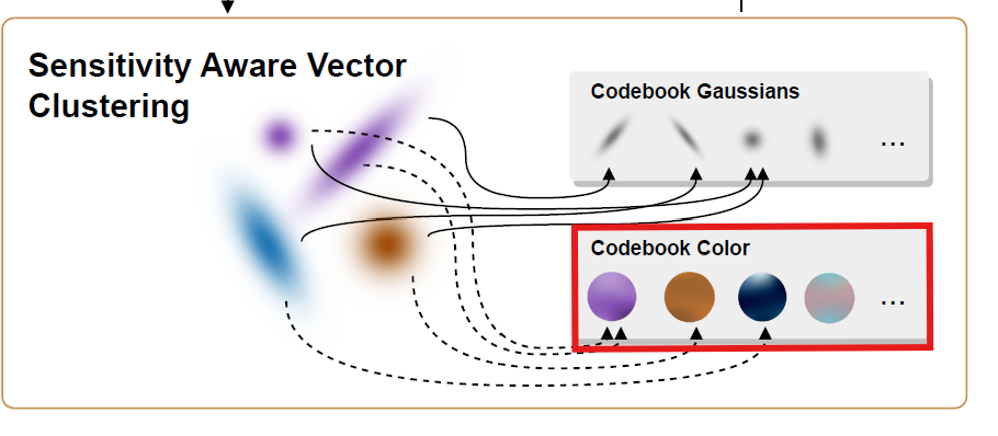 Each Gaussian stores SH coefficients and this paper treat SH coefficients as vectors & compress them into a codebook