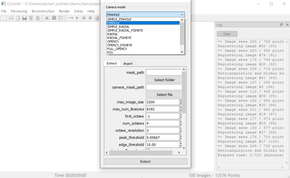 Processing → Camera model 에서 PINHOLE 또는 SIMPLE_PINHOLE 로 변경 → Extract