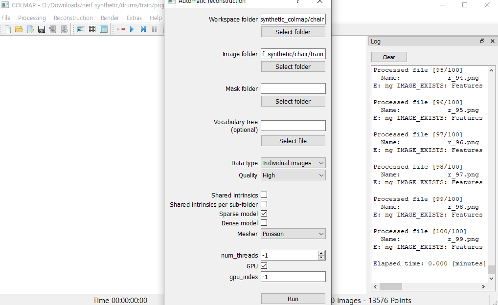 +) 3DGS에서는 Sparse model 만 사용하기 때문에 Dense model 체크 표시를 해제하는 것이 시간 단축에 도움이 된다.