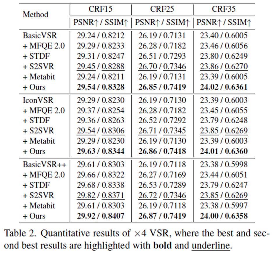 We adopt BasicVSR, IconVSR, and BasicVSR++ on the REDS4 dataset which are trained on ‘clean’ data without considering compression
