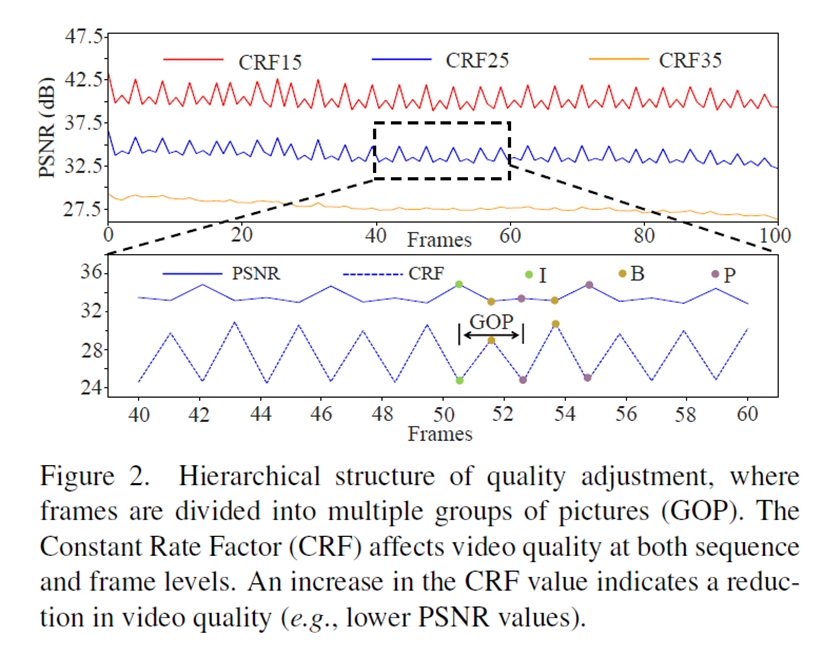 CRF value of each frame adjusted based on CRF_s so that lower CRF_i is assigned for I/P frames to maintain quality and higher CRF_i for B frames for compact representations
