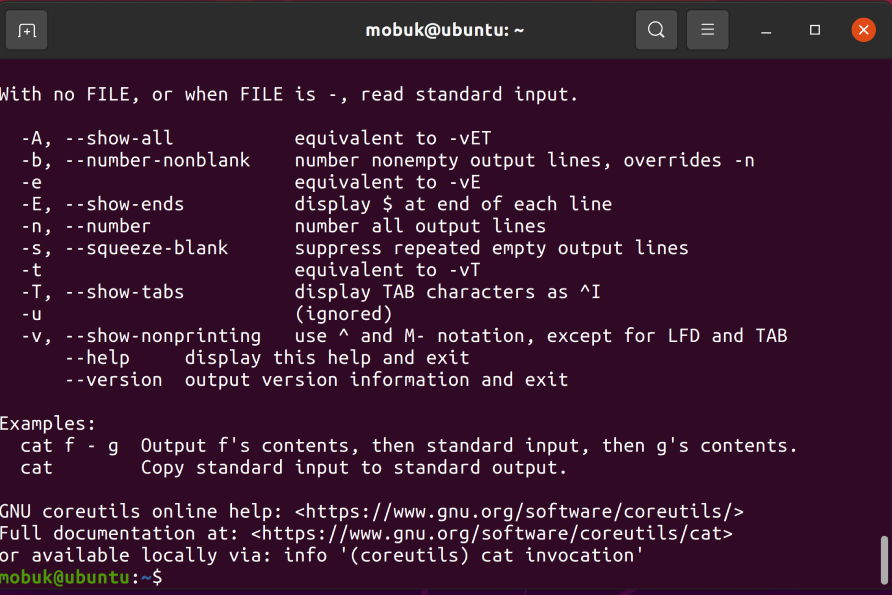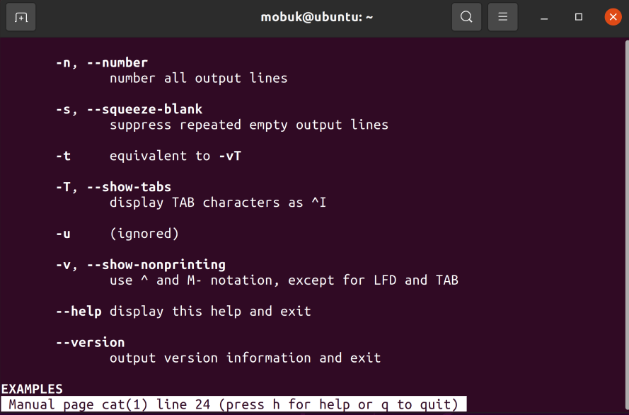 지정한 명령어의 온라인 매뉴얼을 출력한다. --help보다 훨씬 자세한 설명을 가지고 있으며 라이브러리에 대한 설명도 가지고 있다. space를 누르면 스크롤이 되고 q를 누르면 종료된다.
